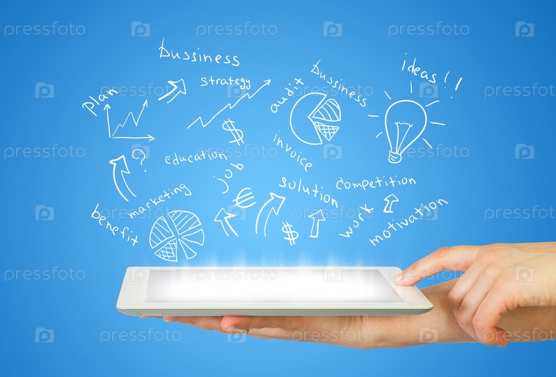 Руки, планшетный компьютер и бизнес-план