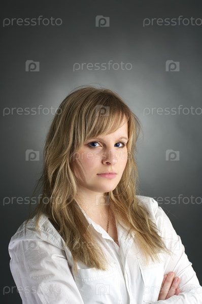 Портрет молодой светловолосой женщины на сером фоне