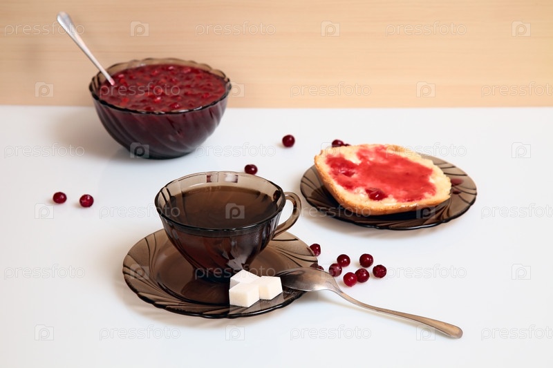 Натюрморт с кружкой чая, бутербродом и вареньем