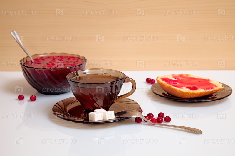 Натюрморт с кружкой чая, бутербродом и вареньем