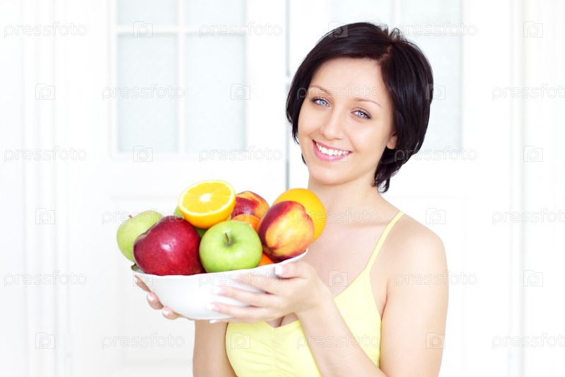 Девушка с фруктами на светлом фоне