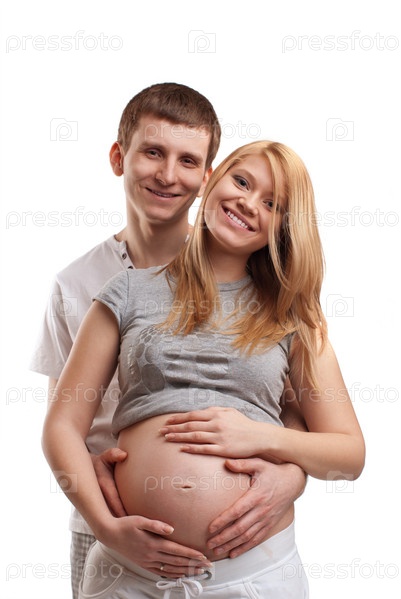 Беременная женщина с мужем на белом фоне