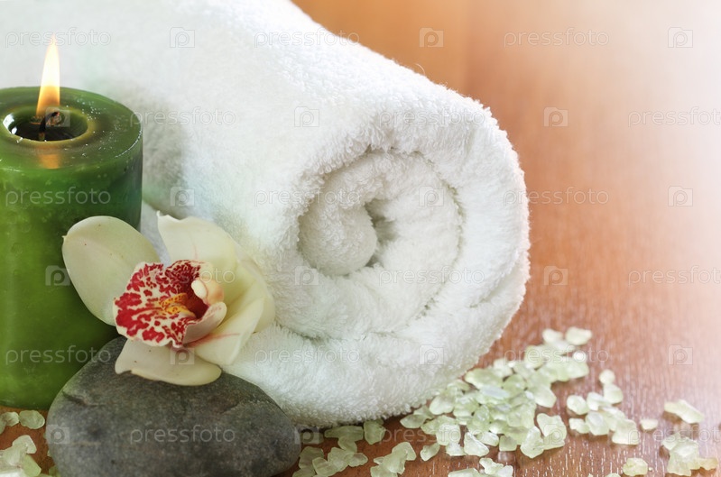 Полотенце, горящая свеча, морская соль и орхидея крупным планом