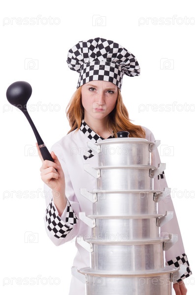 Молодая женщина с кастрюлями