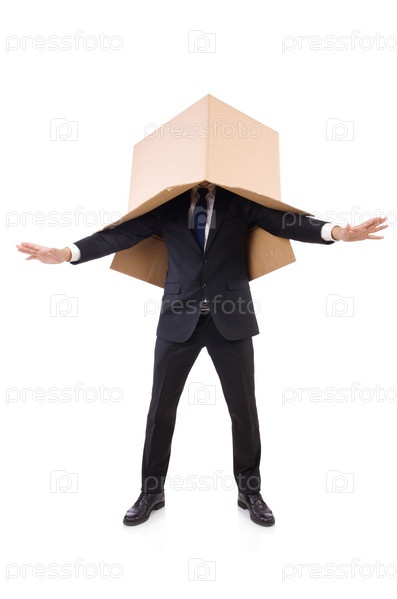 Забавный человек с коробками на белом фоне
