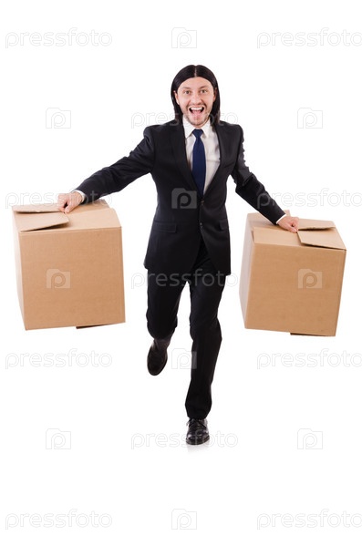 Забавный человек с коробками на белом фоне