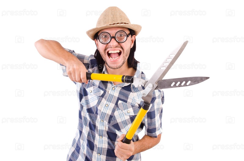 Забавный парень с садовыми ножницами