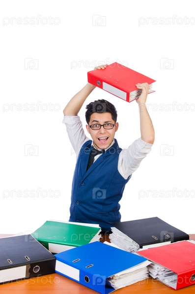 Забавный мужчина с большим количеством папок на белом фоне
