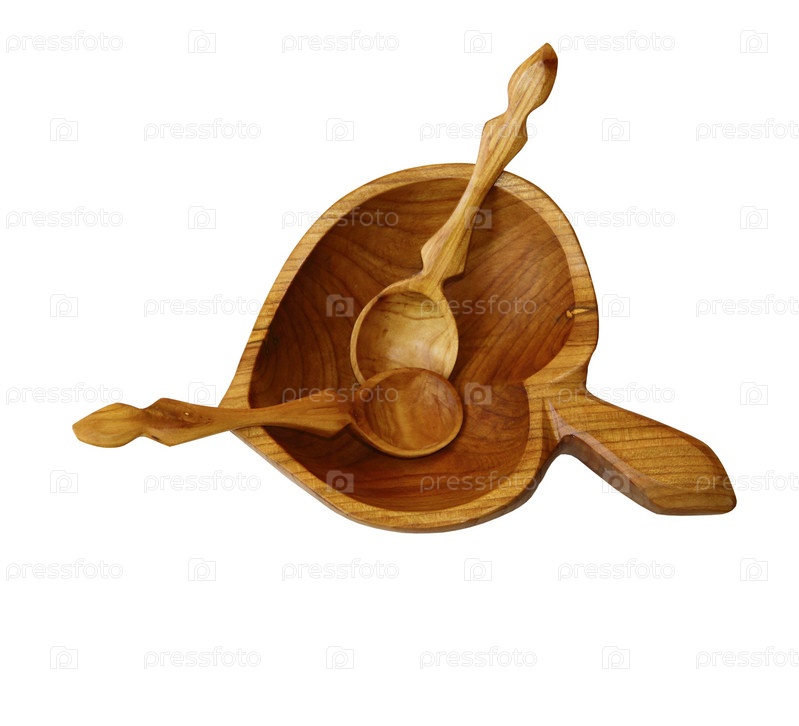 Оригинальная деревянная тарелка и ложки на белом фоне