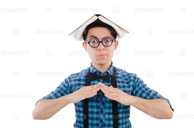 Смешной студент с книгами на белом фоне