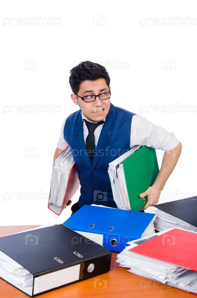 Забавный человек с большим количеством папок на белом фоне