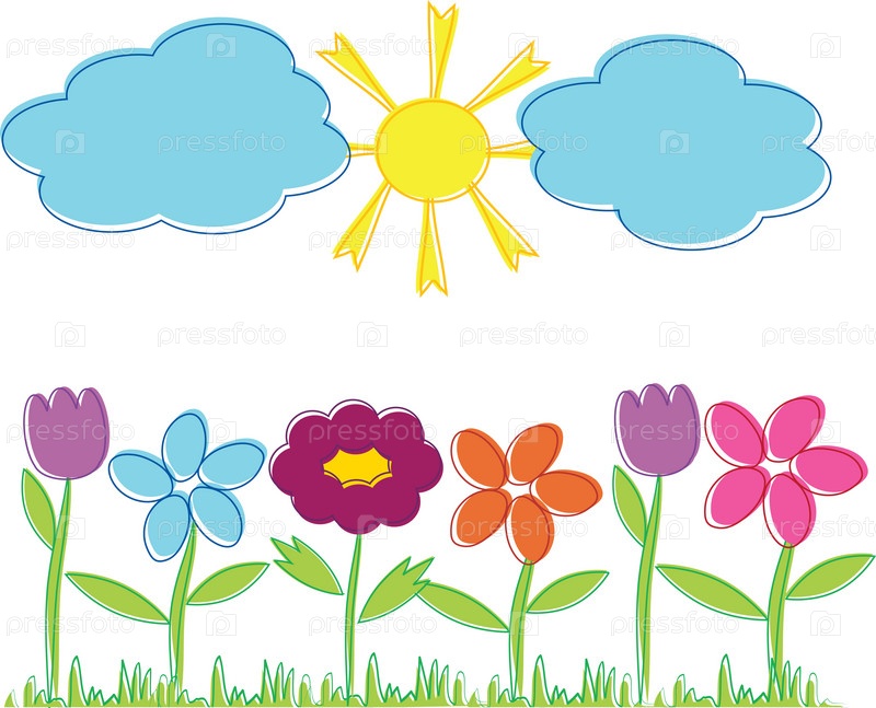 Яркая векторная иллюстрация с цветами, солнцем и облаками на белом фоне