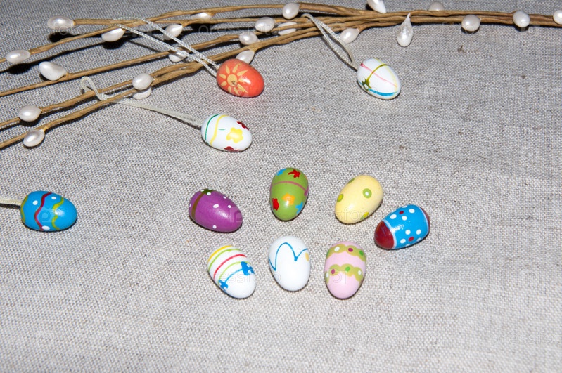 Окрашенные пасхальные яйца с веточкой вербы