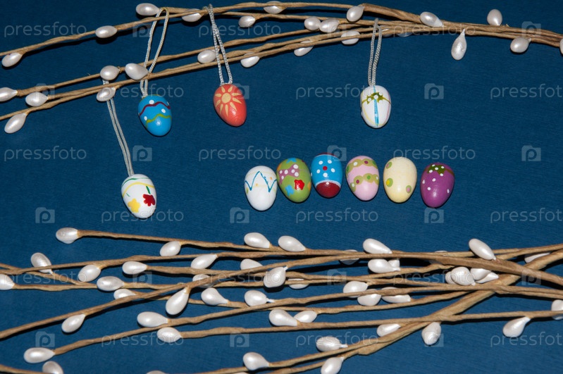 Окрашенные пасхальные яйца с веточкой вербы