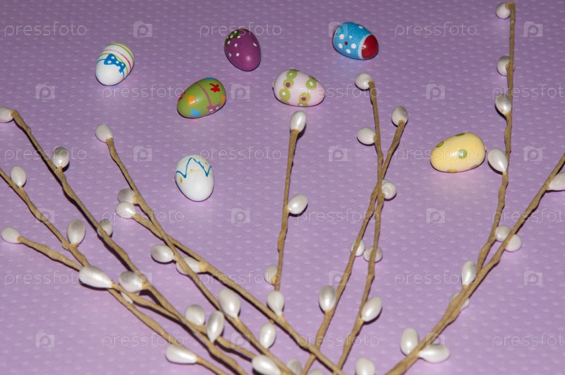 Окрашенные пасхальные яйца с веточкой вербы