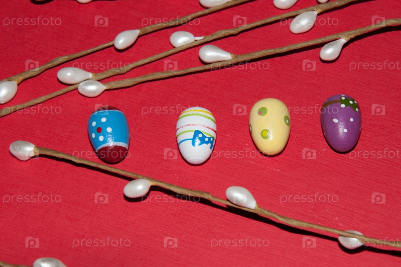 Окрашенные пасхальные яйца с веточкой вербы