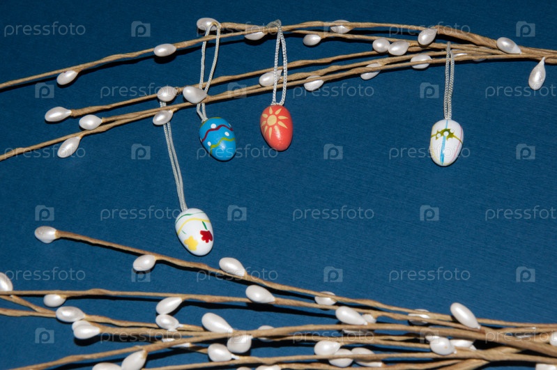 Окрашенные пасхальные яйца с веточкой вербы