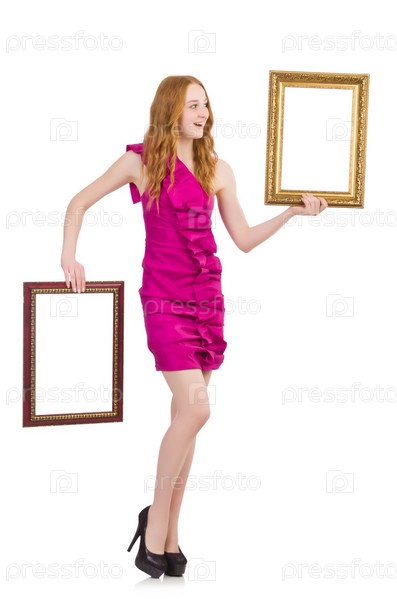 Женщина с фоторамкой на белом фоне
