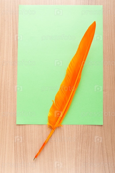 Оранжевое перо и зеленый лист бумаги