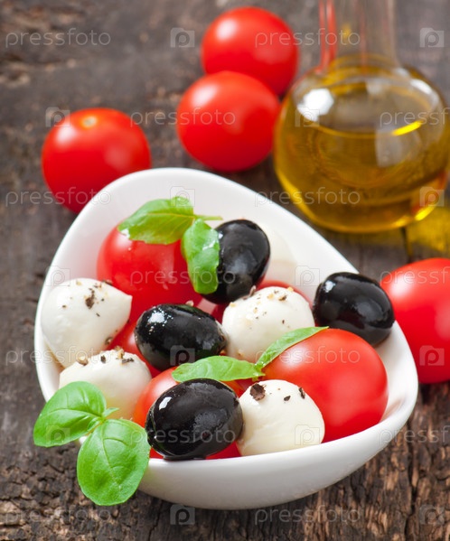 Свежий салат с помидорами черри, базиликом, моцареллой и маслинами