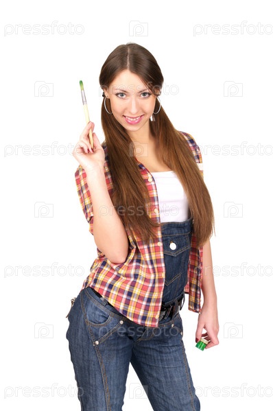 Молодая женщина с кистью, изолирована на белом фоне