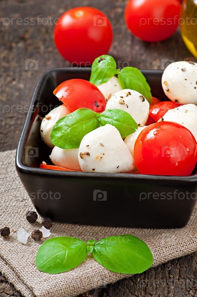 Свежий салат с помидорами черри, базиликом, моцареллой и маслинами