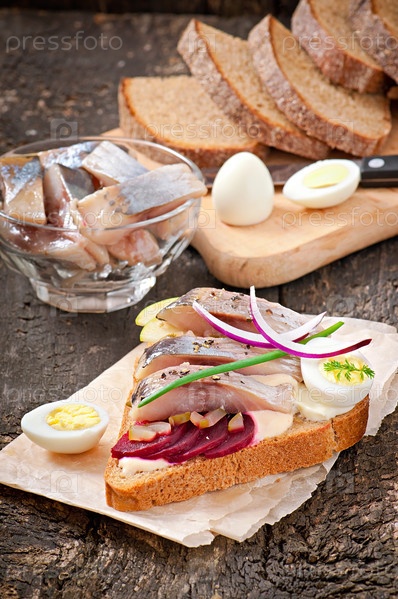 Бутерброд из ржаного хлеба с сельдью, свеклой, луком и яйцом