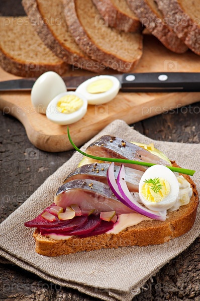 Бутерброд из ржаного хлеба с сельдью, свеклой, луком и яйцом