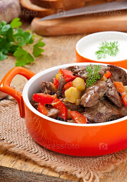 Жареная куриная печень с овощами