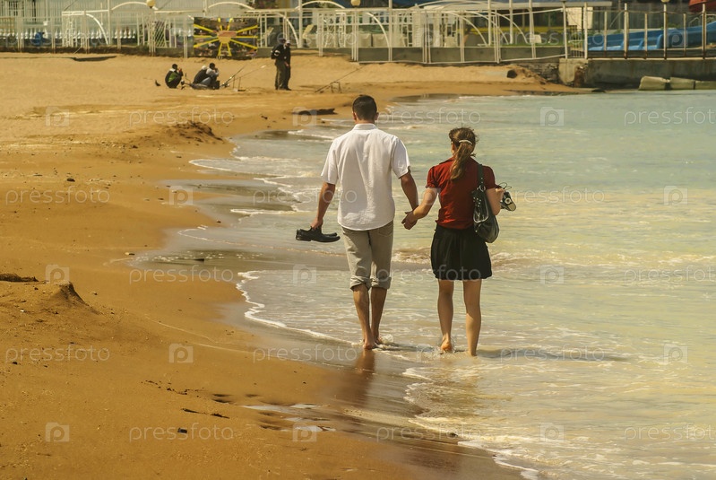 Юноша и девушка идут по песчаному берегу