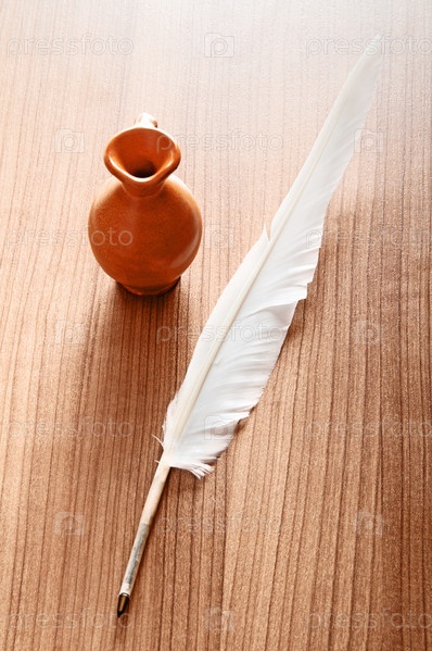 Перо и чернильница крупным планом на столе