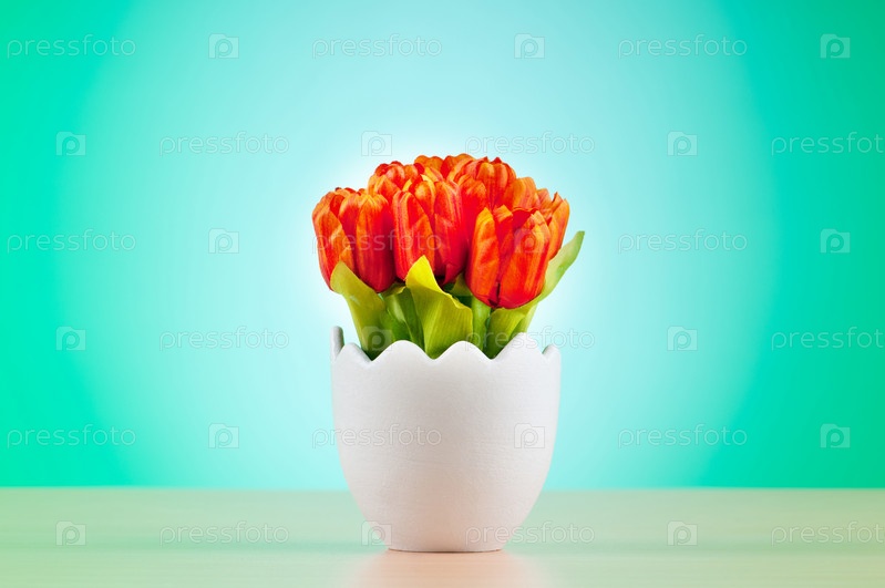 Красные тюльпаны в горшке на ярком фоне