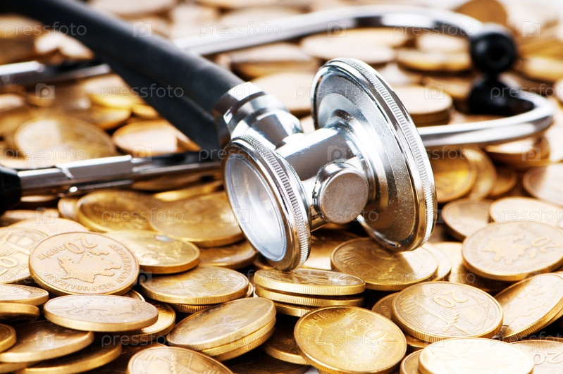 Медицинский стетоскоп и куча золотых монет крупным планом