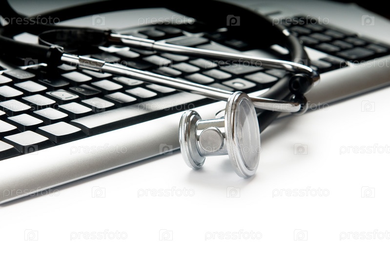 Медицинский стетоскоп и клавиатура крупным планом на белом фоне