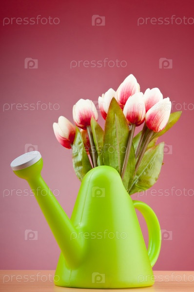 Букет тюльпанов в лейке на ярком фоне