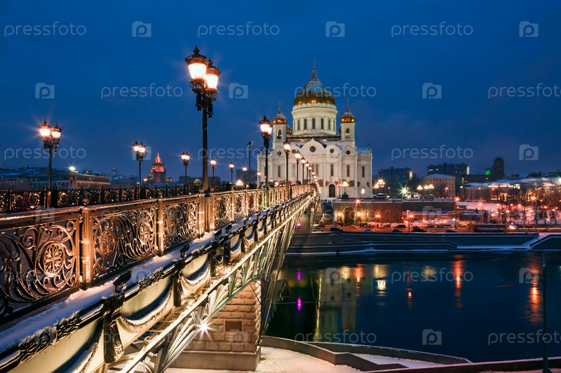 Ночной вид на Храм Христа Спасителя и Патриарший мост в дни новогодних праздников, Москва