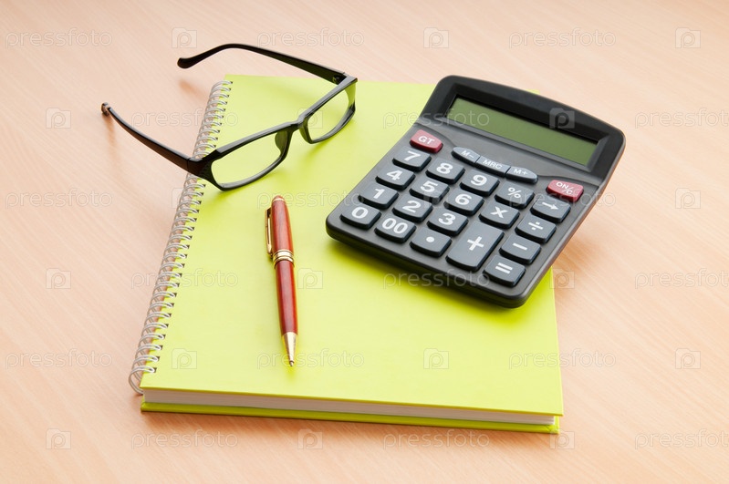 Калькулятор, тетрадь, ручка и очки на столе крупным планом