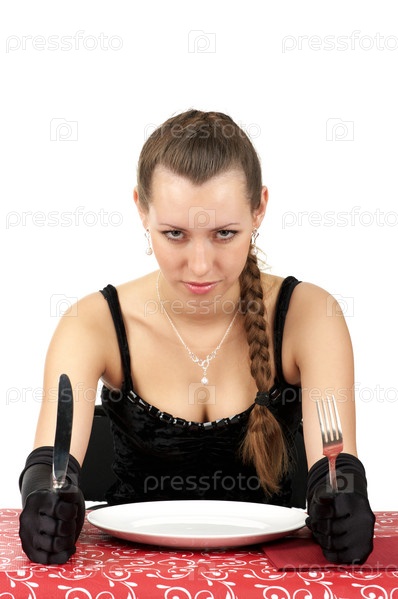 Красивая девушка сидит в ресторане с пустой тарелкой