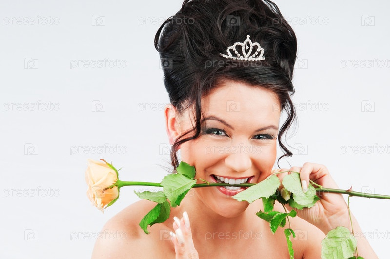 Прекрасная молодая женщина с желтой розой на светлом фоне