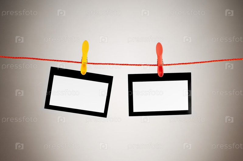 Две пустые фоторамки для фотографий висят на веревке на сером фоне