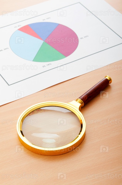 Увеличительное стекло и бизнес-диаграмма на столе
