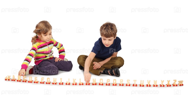 Дети изучают английский алфавит на белом фоне