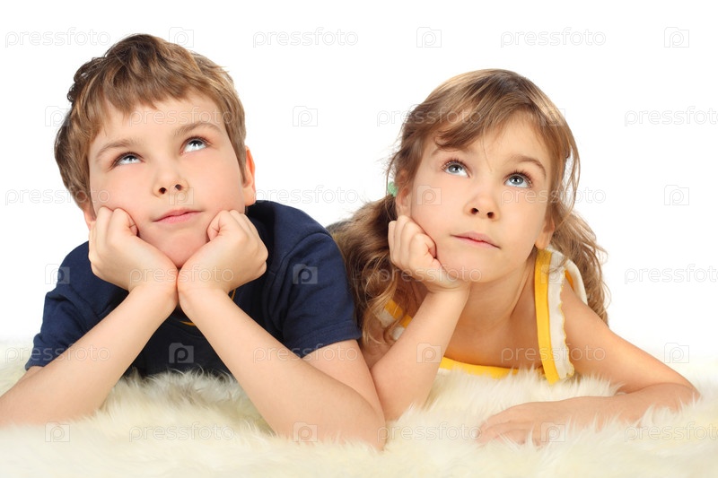 Мальчик и девочка лежат на полу и смотрят наверх