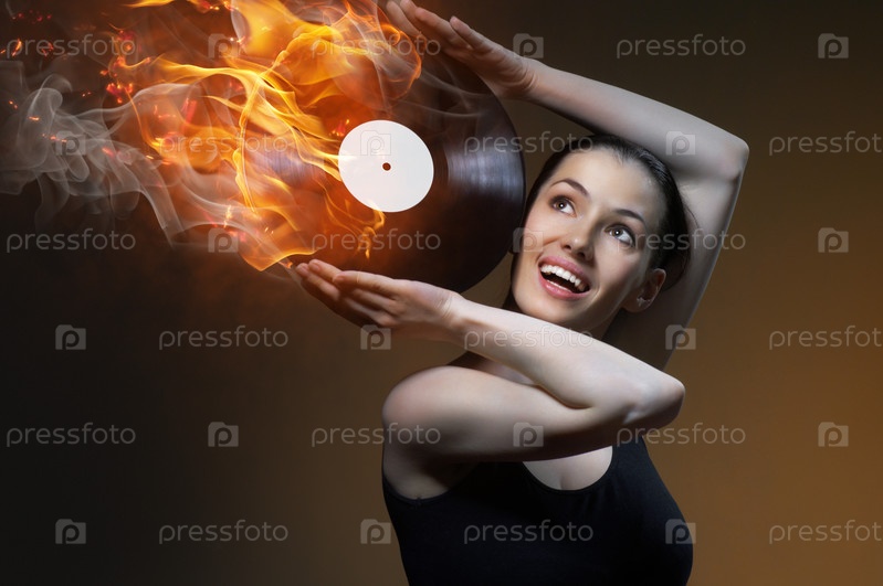 Красивая девушка держит горящую грампластинку