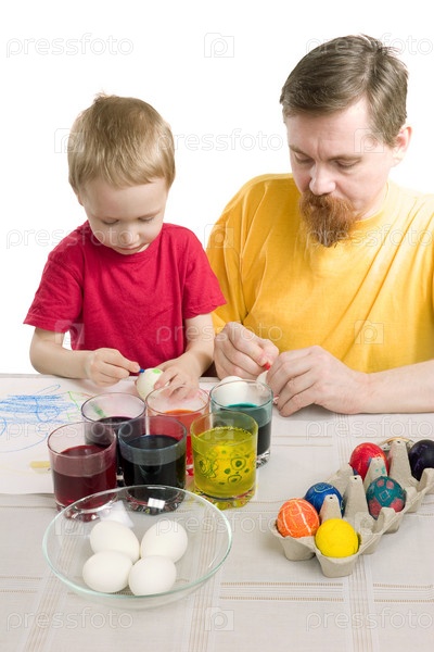Мужчина и мальчик рисуют пасхальные яйца