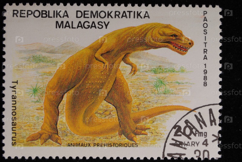 Старая мадагаскарская марка с изображением динозавра крупным планом на черном фоне