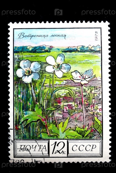 Яркая почтовая марка почты СССР крупным планом на черном фоне