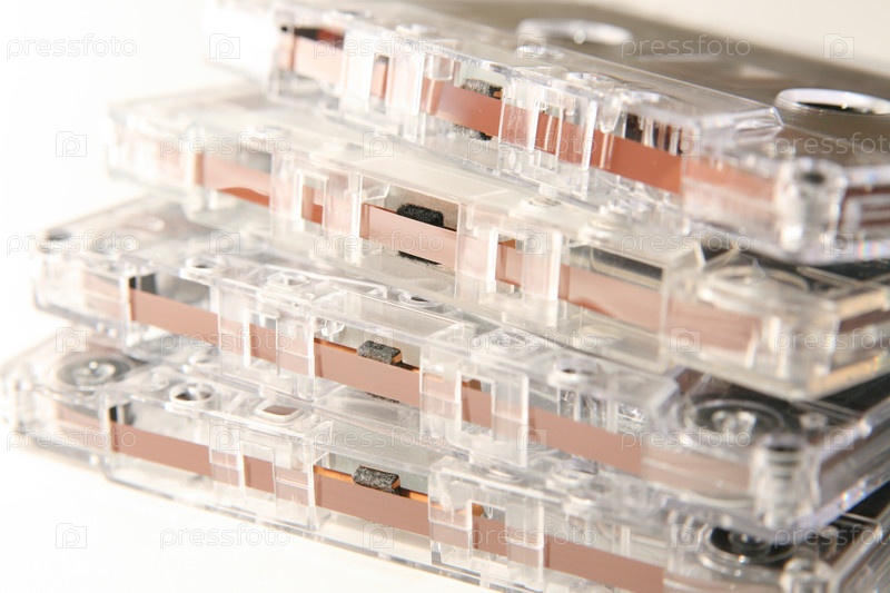 Стопка аудиокассет крупным планом на белом фоне