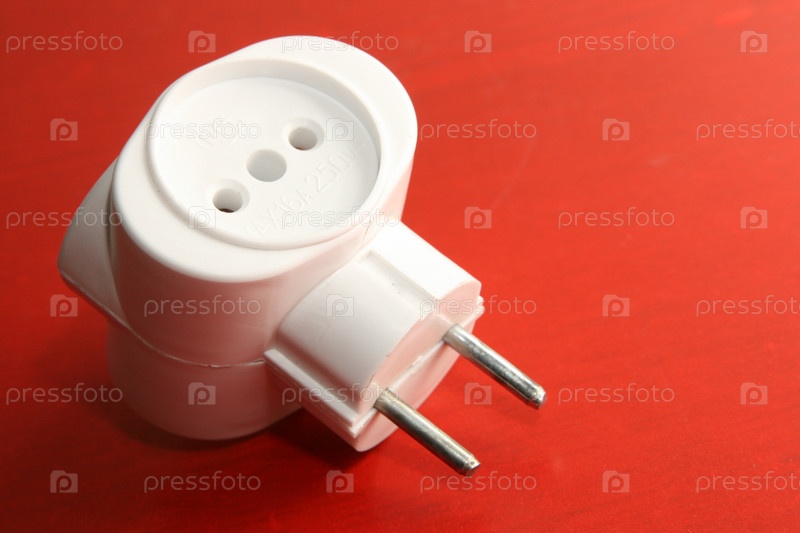 Тройник с вилкой на красном фоне крупным планом