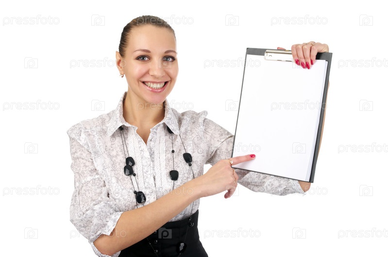 Веселая женщина показывает пустой планшет на белом фоне